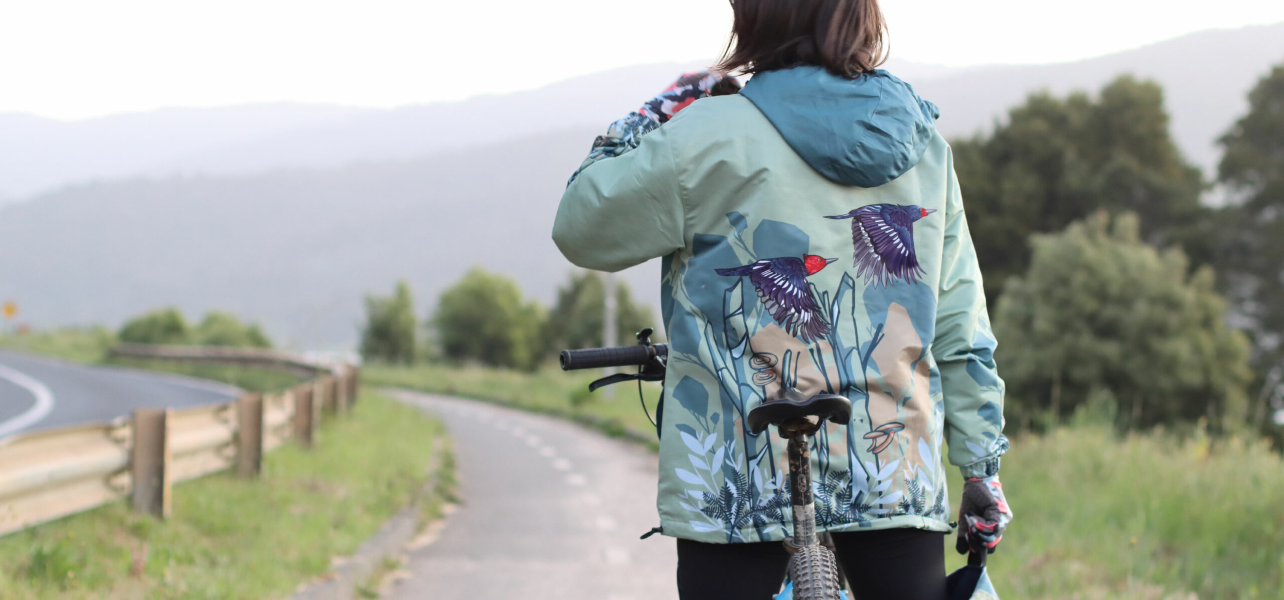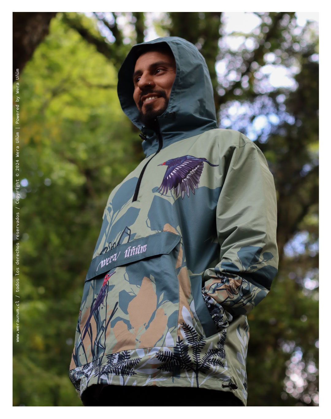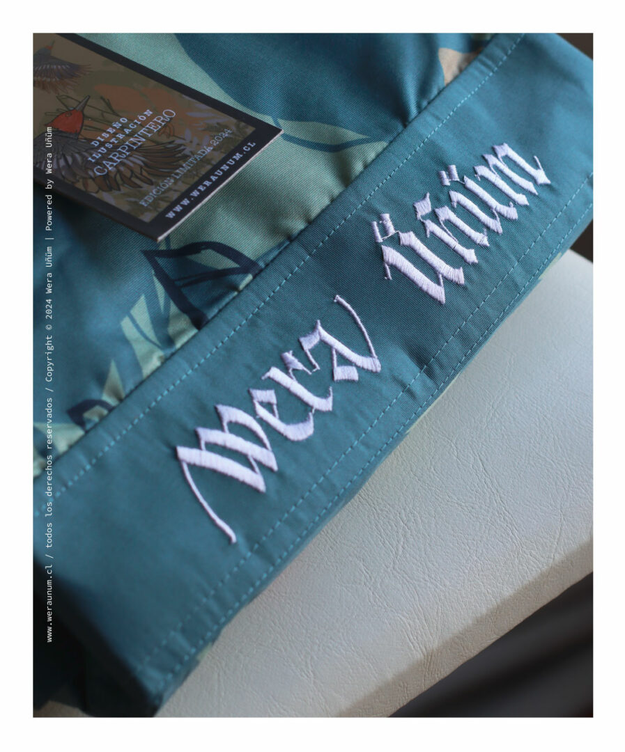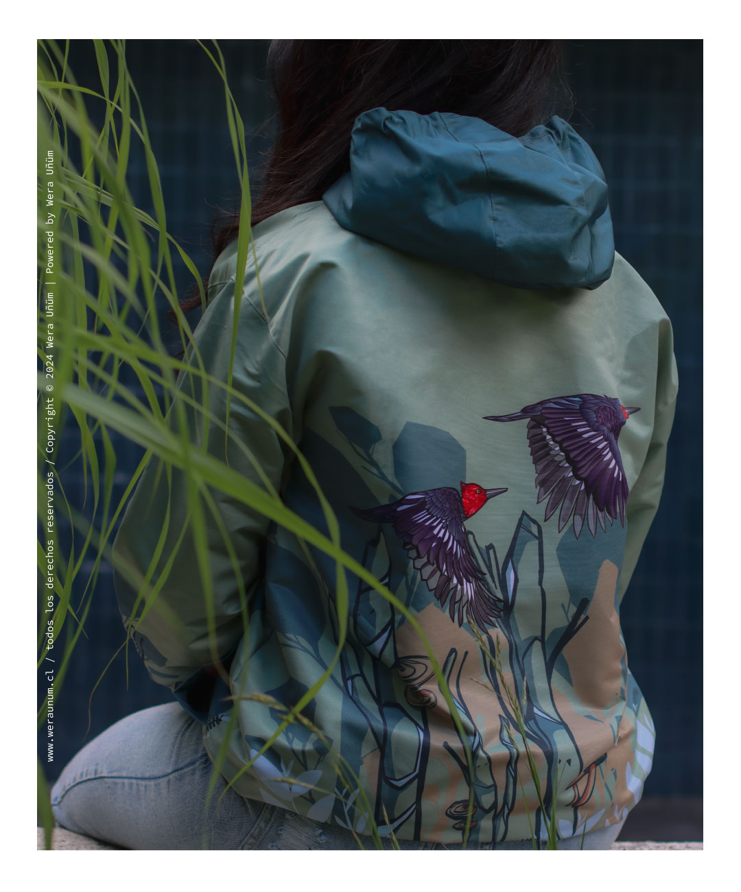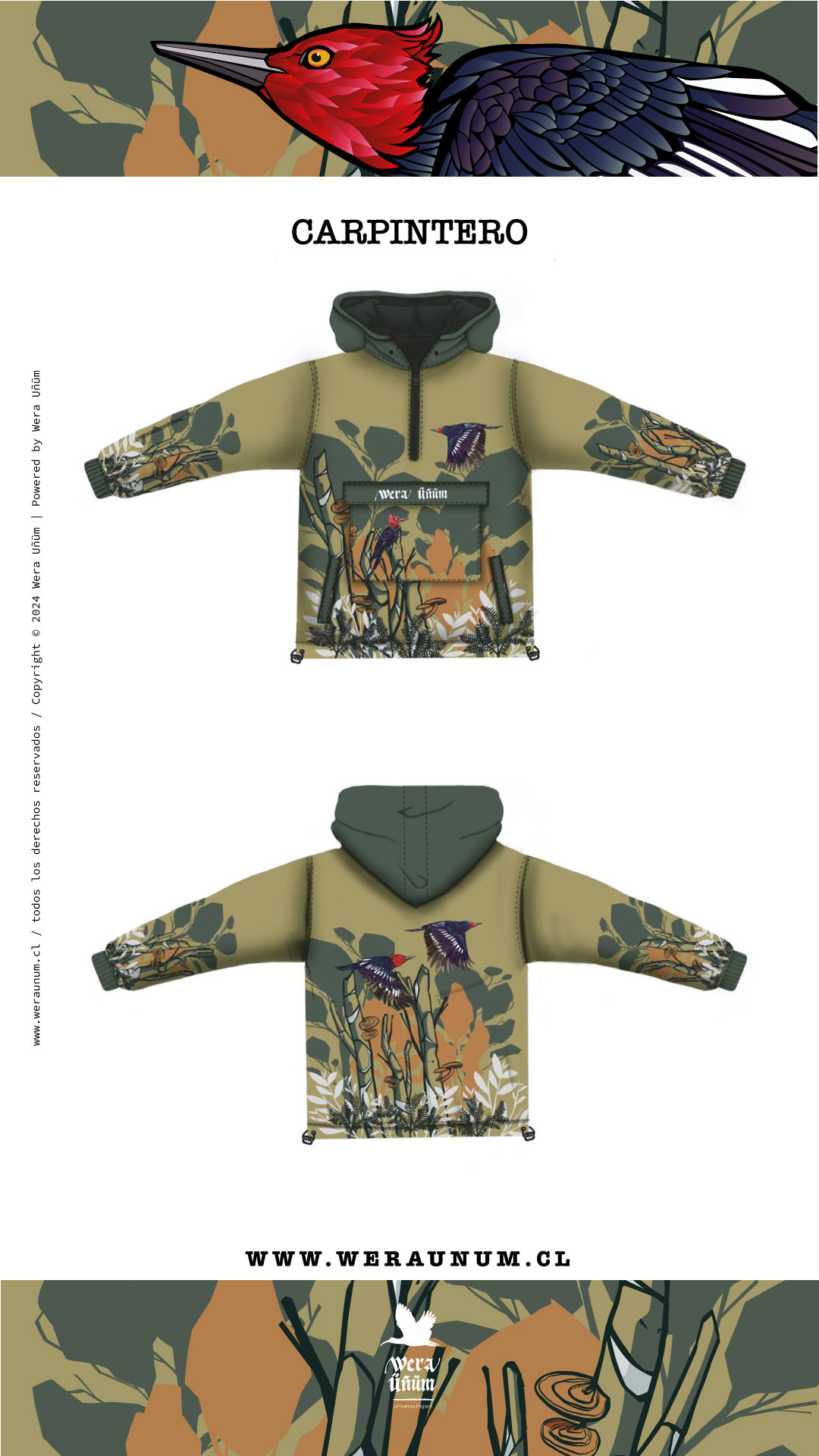 Inspirado en los guardianes de los bosques longevos, el carpintero negro de Magallanes, macho y hembra. Con detalles en la composición de la ilustración de árboles de Hualles y hongos orejas de palo.